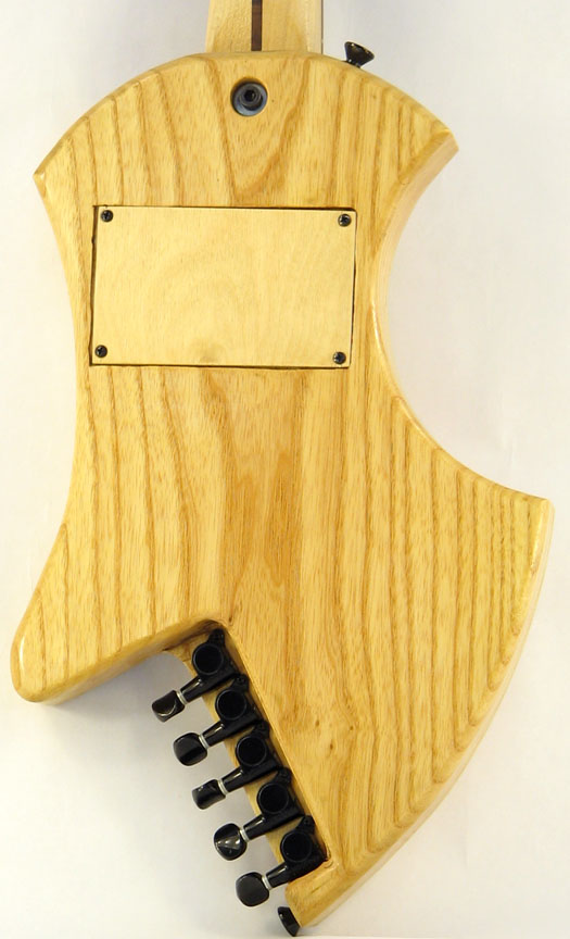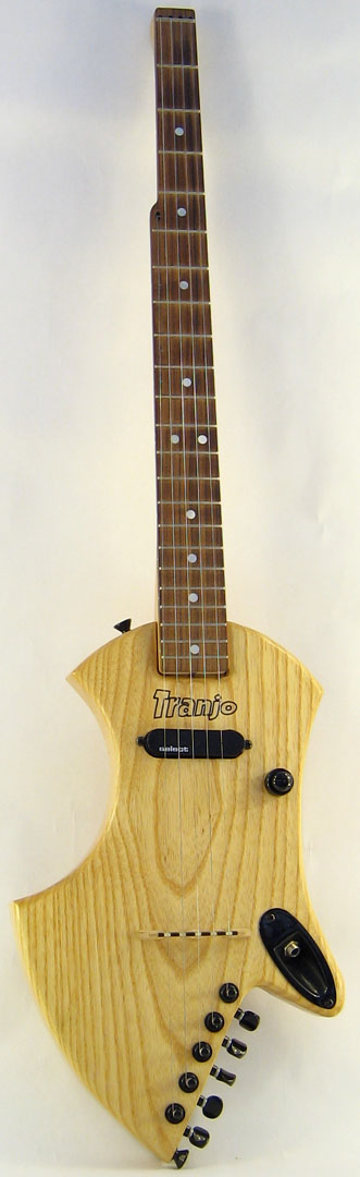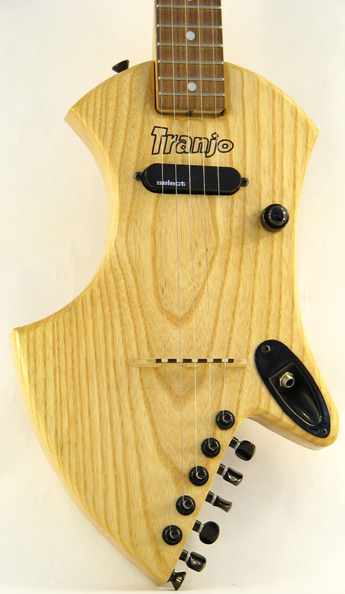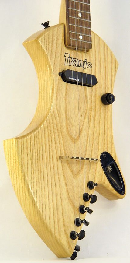 This is my prototype for a solid-body electric travel banjo. The body is ash and the neck is maple with a rosewood fingerboard. The pickup is an EMG Select with a concentric tone/volume control. I used a standard banjo bridge instead of a metal guitar bridge. The body-mounted tuners eliminate the need for a tailpiece. The neck is held in place with one bolt, making it easy to remove for travel. The entire TranjoCaster fits into a standard carry-on suitcase, just like my acoustic travel banjo, the Tranjo.